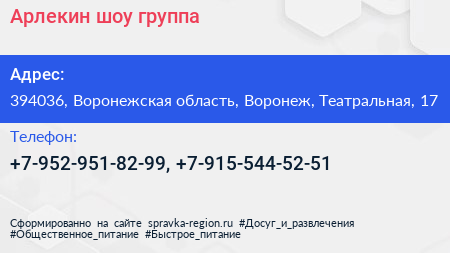 Арлекин, шоу-группа по адресу 394036, Воронежская область, Воронеж, Театральная, 17 в дальнейшем Организация, размещена в следующих категориях: