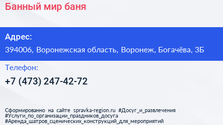 Банный мир, баня по адресу 394006, Воронежская область, Воронеж, Богачёва, 3Б в дальнейшем Организация, размещена в следующих категориях: