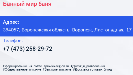 Банный мир, баня по адресу 394057, Воронежская область, Воронеж, Листопадная, 17 в дальнейшем Организация, размещена в следующих категориях: