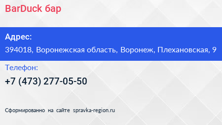 BarDuck, бар по адресу 394018, Воронежская область, Воронеж, Плехановская, 9 в дальнейшем Организация, размещена в следующих категориях: