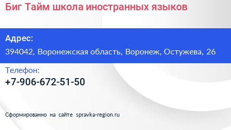 Биг Тайм, школа иностранных языков по адресу 394042, Воронежская область, Воронеж, Остужева, 26 в дальнейшем Организация, размещена в следующих категориях: