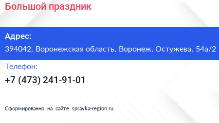 Большой праздник по адресу 394042, Воронежская область, Воронеж, Остужева, 54а/2 в дальнейшем Организация, размещена в следующих категориях: