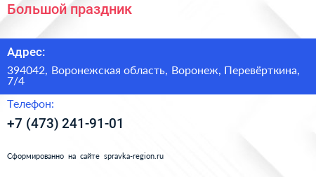 Большой праздник по адресу 394042, Воронежская область, Воронеж, Перевёрткина, 7/4 в дальнейшем Организация, размещена в следующих категориях: