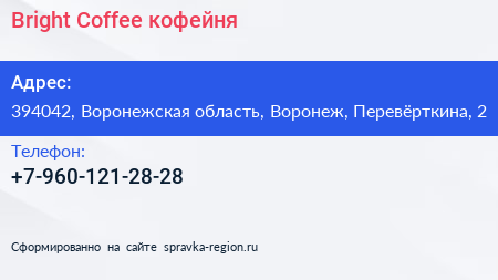 Bright Coffee, кофейня по адресу 394042, Воронежская область, Воронеж, Перевёрткина, 2 в дальнейшем Организация, размещена в следующих категориях: