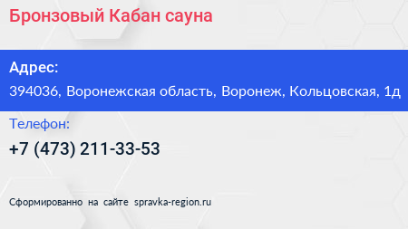 Бронзовый Кабан, сауна по адресу 394036, Воронежская область, Воронеж, Кольцовская, 1д в дальнейшем Организация, размещена в следующих категориях: