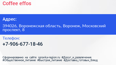 Coffee effos по адресу 394026, Воронежская область, Воронеж, Московский проспект, 8 в дальнейшем Организация, размещена в следующих категориях: