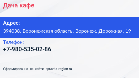 Дача, кафе по адресу 394038, Воронежская область, Воронеж, Дорожная, 19 в дальнейшем Организация, размещена в следующих категориях: