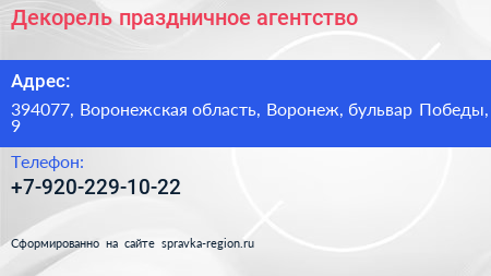 Декорель, праздничное агентство по адресу 394077, Воронежская область, Воронеж, бульвар Победы, 9 в дальнейшем Организация, размещена в следующих категориях: