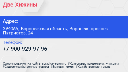Две Хижины по адресу 394065, Воронежская область, Воронеж, проспект Патриотов, 24 в дальнейшем Организация, размещена в следующих категориях: