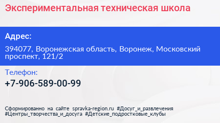 Экспериментальная техническая школа по адресу 394077, Воронежская область, Воронеж, Московский проспект, 121/2 в дальнейшем Организация, размещена в следующих категориях: