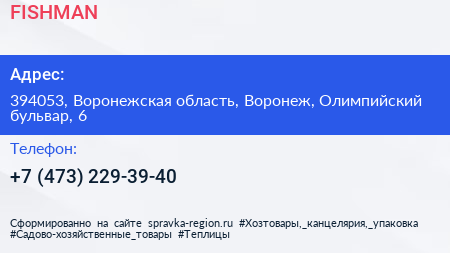 FISHMAN по адресу 394053, Воронежская область, Воронеж, Олимпийский бульвар, 6 в дальнейшем Организация, размещена в следующих категориях: