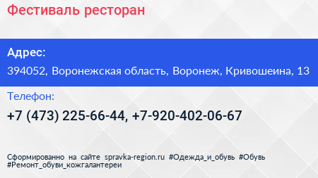 Фестиваль, ресторан по адресу 394052, Воронежская область, Воронеж, Кривошеина, 13 в дальнейшем Организация, размещена в следующих категориях:
