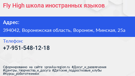Fly High, школа иностранных языков по адресу 394042, Воронежская область, Воронеж, Минская, 25а в дальнейшем Организация, размещена в следующих категориях: