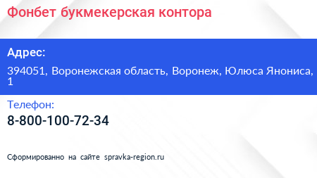 Фонбет, букмекерская контора по адресу 394051, Воронежская область, Воронеж, Юлюса Янониса, 1 в дальнейшем Организация, размещена в следующих категориях: