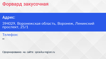 Форвард, закусочная по адресу 394029, Воронежская область, Воронеж, Ленинский проспект, 25/1 в дальнейшем Организация, размещена в следующих категориях: