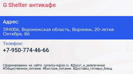 G.Shelter, антикафе по адресу 394006, Воронежская область, Воронеж, 20-летия Октября, 86 в дальнейшем Организация, размещена в следующих категориях:
