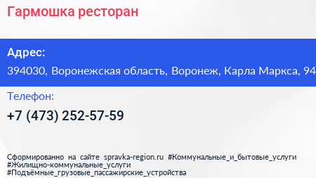 Гармошка, ресторан по адресу 394030, Воронежская область, Воронеж, Карла Маркса, 94 в дальнейшем Организация, размещена в следующих категориях: