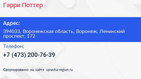 Гарри Поттер по адресу 394033, Воронежская область, Воронеж, Ленинский проспект, 172 в дальнейшем Организация, размещена в следующих категориях: