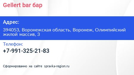 Gellert bar, бар по адресу 394053, Воронежская область, Воронеж, Олимпийский жилой массив, 3 в дальнейшем Организация, размещена в следующих категориях: