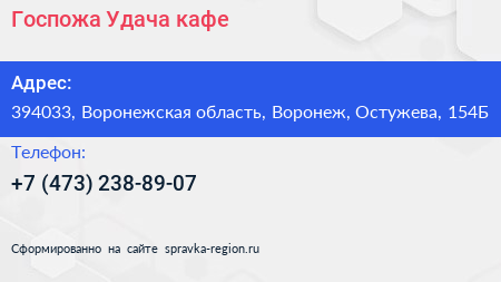 Госпожа Удача, кафе по адресу 394033, Воронежская область, Воронеж, Остужева, 154Б в дальнейшем Организация, размещена в следующих категориях: