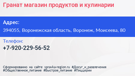 Гранат, магазин продуктов и кулинарии по адресу 394055, Воронежская область, Воронеж, Моисеева, 80 в дальнейшем Организация, размещена в следующих категориях: