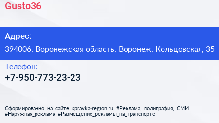 Gusto36 по адресу 394006, Воронежская область, Воронеж, Кольцовская, 35 в дальнейшем Организация, размещена в следующих категориях: