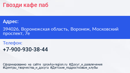 Гвозди, кафе-паб по адресу 394026, Воронежская область, Воронеж, Московский проспект, 7е в дальнейшем Организация, размещена в следующих категориях: