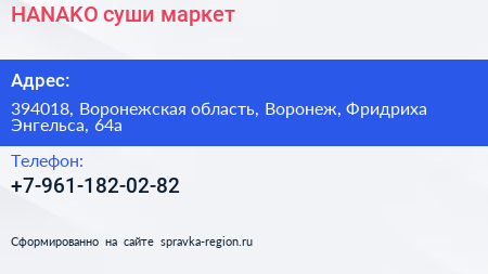 HANAKO, суши-маркет по адресу 394018, Воронежская область, Воронеж, Фридриха Энгельса, 64а в дальнейшем Организация, размещена в следующих категориях: