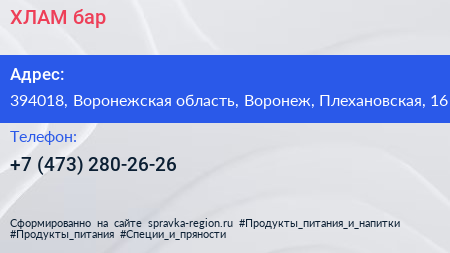 ХЛАМ, бар по адресу 394018, Воронежская область, Воронеж, Плехановская, 16 в дальнейшем Организация, размещена в следующих категориях: