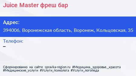 Juice Master, фреш-бар по адресу 394006, Воронежская область, Воронеж, Кольцовская, 35 в дальнейшем Организация, размещена в следующих категориях:
