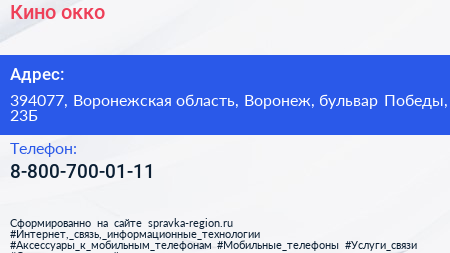 Кино окко по адресу 394077, Воронежская область, Воронеж, бульвар Победы, 23Б в дальнейшем Организация, размещена в следующих категориях:
