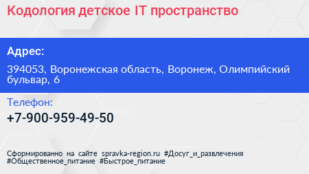 Кодология, детское IT-пространство по адресу 394053, Воронежская область, Воронеж, Олимпийский бульвар, 6 в дальнейшем Организация, размещена в следующих категориях: