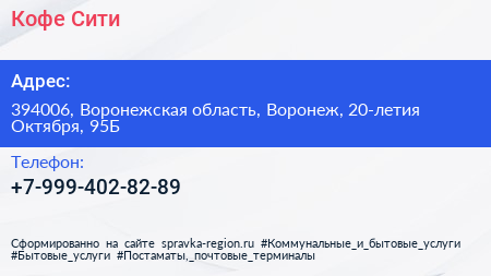 Кофе Сити по адресу 394006, Воронежская область, Воронеж, 20-летия Октября, 95Б в дальнейшем Организация, размещена в следующих категориях: