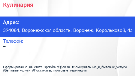 Кулинария по адресу 394084, Воронежская область, Воронеж, Корольковой, 4а в дальнейшем Организация, размещена в следующих категориях: