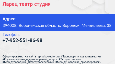 Ларец, театр-студия по адресу 394008, Воронежская область, Воронеж, Менделеева, 38 в дальнейшем Организация, размещена в следующих категориях: