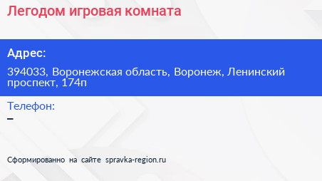 Легодом, игровая комната по адресу 394033, Воронежская область, Воронеж, Ленинский проспект, 174п в дальнейшем Организация, размещена в следующих категориях: