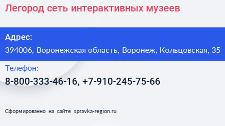 Легород, сеть интерактивных музеев по адресу 394006, Воронежская область, Воронеж, Кольцовская, 35 в дальнейшем Организация, размещена в следующих категориях: