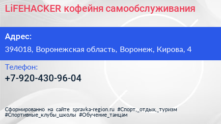 LiFEHACKER, кофейня самообслуживания по адресу 394018, Воронежская область, Воронеж, Кирова, 4 в дальнейшем Организация, размещена в следующих категориях: