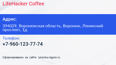 LifeHacker Coffee по адресу 394029, Воронежская область, Воронеж, Ленинский проспект, 1д в дальнейшем Организация, размещена в следующих категориях: