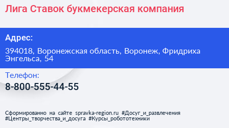 Лига Ставок, букмекерская компания по адресу 394018, Воронежская область, Воронеж, Фридриха Энгельса, 54 в дальнейшем Организация, размещена в следующих категориях: