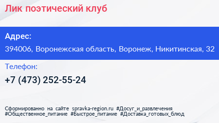Лик, поэтический клуб по адресу 394006, Воронежская область, Воронеж, Никитинская, 32 в дальнейшем Организация, размещена в следующих категориях: