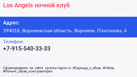 Los Angels, ночной клуб по адресу 394018, Воронежская область, Воронеж, Платонова, 4 в дальнейшем Организация, размещена в следующих категориях:
