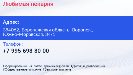 Любимая пекарня по адресу 394062, Воронежская область, Воронеж, Южно-Моравская, 34/1 в дальнейшем Организация, размещена в следующих категориях:
