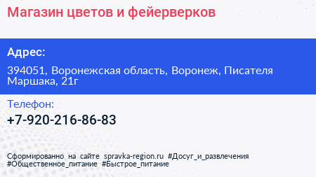 Магазин цветов и фейерверков по адресу 394051, Воронежская область, Воронеж, Писателя Маршака, 21г в дальнейшем Организация, размещена в следующих категориях: