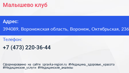 Малышево, клуб по адресу 394089, Воронежская область, Воронеж, Октябрьская, 236 в дальнейшем Организация, размещена в следующих категориях: