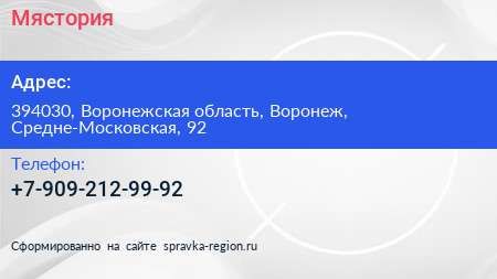 Мястория по адресу 394030, Воронежская область, Воронеж, Средне-Московская, 92 в дальнейшем Организация, размещена в следующих категориях: