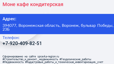 Моне, кафе-кондитерская по адресу 394077, Воронежская область, Воронеж, бульвар Победы, 23Б в дальнейшем Организация, размещена в следующих категориях: