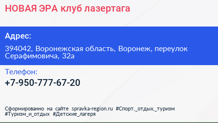 НОВАЯ ЭРА, клуб лазертага по адресу 394042, Воронежская область, Воронеж, переулок Серафимовича, 32а в дальнейшем Организация, размещена в следующих категориях: