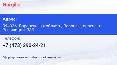 Nargilia по адресу 394036, Воронежская область, Воронеж, проспект Революции, 33Б в дальнейшем Организация, размещена в следующих категориях: