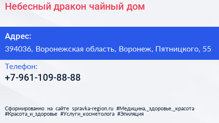 Небесный дракон, чайный дом по адресу 394036, Воронежская область, Воронеж, Пятницкого, 55 в дальнейшем Организация, размещена в следующих категориях: